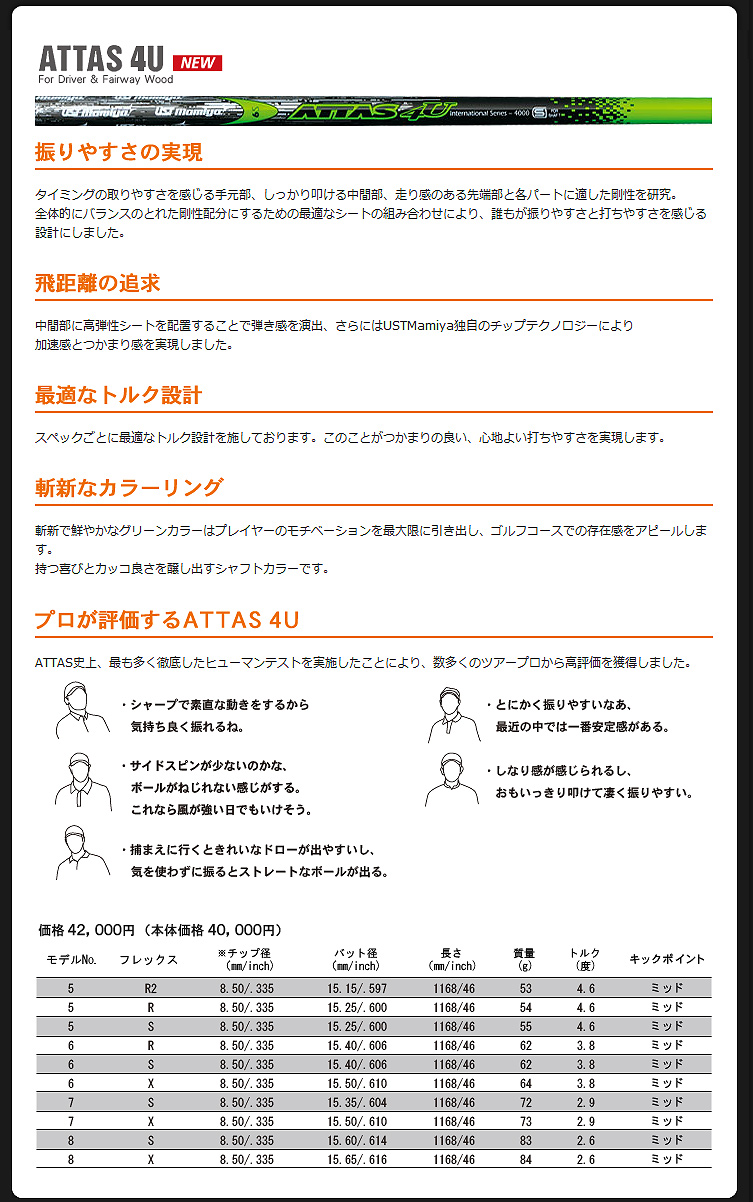 ATTAS 4U ก้านพรีเมี่ยมรุ่นใหม่ล่าสุดประจำปี 2013 จาก UST-Mamiya ออกแบบอยู่บนพื้นฐานความเหมาะสมกับทุกวงสวิง(For You) วัสดุหลักที่ใช้คือ Hi-Modulus Carbon 70T เกรดสูงสุด ช่วยให้ได้ Ball Speed เกินพิกัด เพิ่มระยะ ฟิลลิ่งและความมั่นคงของลูกกอล์ฟ และด้วยการออกแบบ EI-Curve อัตราความแข็งระหว่างปลายก้านและโคนก้านอย่างเหมาะสม ช่วยป้องกันอาการ Hook/Slice ของลูก และช่วยลด Back Spin ได้เป็นอย่างดี